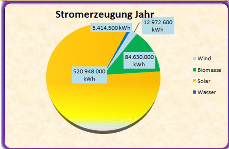 Die derzeitig erneuerbare Energie, die im Landkreis erzeugt wird, kommt von der Sonne, kleiner Anteil an Wind, Wasserkraft und Biomasse (Strom und Wärme).