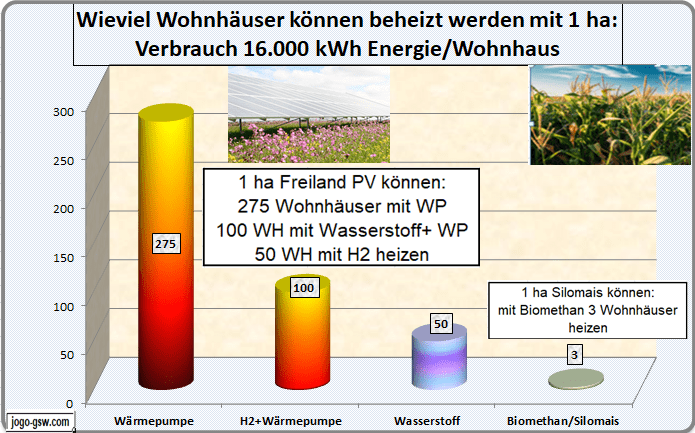 Biomethan ist knapp und teuer. Bisher wird Biomethan hauptsächlich aus Silomais hergestellt. Mit einem ha Silomais kann man ca. 45.000 kWh Biomethan herstellen. damit kann man also drei Wohnhäuser heizen. Möchte man mit Wasserstoff direkt heizen kann man mit einem ha Freiland PV ca. 50 Wohnhäuser heizen. Verheizt man den Wasserstoff nicht direkt, sondern erzeugt mit einer Brennstoffzelle Strom und dieser Strom treibt eine Wärmepumpe an, kann man 100 Wohnhäuser heizen. Verwendet man aber den Strom direkt von einem ha Freiland PV kann man über eine Wärmepumpe 275 Wohnhäuser heizen. Berechnung: 1 ha PV erzeugt 1.100.000 kWh, ein Wohnhaus mit 16.000 kWh Energieverbrauch braucht mit Wärmepumpe 4.000 kWh Strom. 1.100.000/4.000=275. Wir müssen unsere Energie am effizientesten nutzen. Deshalb sollten wir nicht den Fehler machen und hier auf die Erdgasversorger hören.