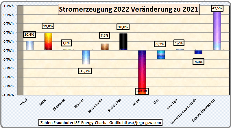 Das Jahr 2022 war von der Energiekrise geprägt. Deshalb ist es für mich und vielleicht auch für Euch interessant, wie sich die Stromproduktion 2022 zusammensetzt. Ich habe dann gleich auch eine Grafik eingefügt über die Veränderung zu 2021. Erfreulich ist die Zunahme des Windstroms (+10 %) und des Solarstroms (+19 %). Interessant ist der Rückgang des Nettostromverbrauchs (ist der Strom, der aus der Steckdose kommt) um 4 % und das, obwohl es mehr E-Autos und Wärmepumpen gibt. Es wurde Strom gespart, das war erfreulich. Auf der anderen Seite hat aber der Kohlestrom zugenommen. Hier vor allem zu Gunsten des Exportüberschusses (+42,5 %) sowie der Stromproduktion von Erdgas (-9,3 %) und das Abschalten von 3 AKW’s (-49,8 %). Wir sehen, Windstrom ist mit einem Anteil von knapp 25 % die wichtigste Stromerzeugungsart. 2022 wurden insgesamt 11 GW PV und Wind in Deutschland zugebaut. Damit kann man die Stromproduktion von 1 Atomkraftwerk ersetzen.