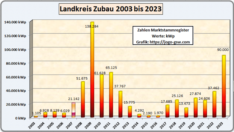 2023 werden wieder mehr größere Dachanlagen gebaut. Gerade das Segment bis 30 kWp wird kräftig zulegen, ebenso die Freiflächenanlagen. Die Dächer können jetzt vollgemacht werden, denn die 10 kWp Grenze spielt keine Rolle mehr. 2023 wird deshalb der Zubau über 90 MW betragen und sich dadurch mehr als verdoppeln. Der Gesamtzubau wird dann Ende dieses Jahres bei ca. 660 MW liegen. Damit kann der jetzige Strombedarf des Landkreises bilanziell abgedeckt werden. Interessant, im Klimaschutzkonzept des Landkreises, das 2021 erstellt wurde, ging das Ingenieurbüro im Jahre 2050 von einer Gesamtleistung von nur 500 MW aus. In unserem Landkreis wird der Strombedarf durch die Umstellung der Wärmeerzeugung weg von Öl und Gas auf elektrische Wärmepumpen und Biomasse sowie die Elektrifizierung des Verkehrs um das 2,5 fache zunehmen. Außerdem muss das Land die Städte mit Energie versorgen. Bayern möchte ja bis 2040 klimaneutral werden, das bedeutet bis dahin das aus für Öl (Heizöl, Benzin, Diesel) und fossiles Gas.