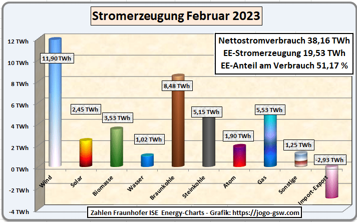 Auch im Februar erreichte die Stromproduktion aus Sonne, Wind, Bio und Wasser mit 51,17 % des Nettostromverbrauchs wieder über 50 %. Windstrom, mit einem Anteil von 31 %, lierferte dabei den meisten Strom. Der Exportüberschuss lag bei 7,6 %. Frankreich benötigt immer noch eine Menge Strom aus Deutschland. Dieser wurde diesmal mit Kohle und Gas bereitgestellt. Die Windstromproduktion im Februar war 50 % niedriger als im Januar. Bei unserem GSW Anlagen erzeugten die Windenergieanlagen im Februar 10 % der geplanten Jahreserzeugung, im Januar waren es 14 %. In den nächsten Monaten wird der Solarstrom seinen Anteil jeden Monat steigern. Der Strompreis an der Börse war im Februar um ca. 1,5 Cent/kWh höher als im Januar. Das lag am geringeren Windangebot.