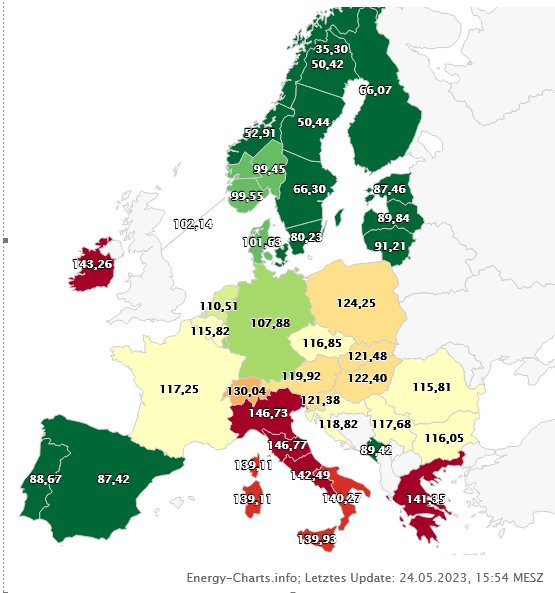 In der Grafik sind die europäischen Börsenstrompreise 2023 (Euro/MWh) dargestellt. Deutschland hat einen niedrigeren Börsenstrompreis als fast alle unsere Nachbarländer. In Frankreich (Atomstromland) bis nach dem Kohlestromland Polen sind die Preise um bis zu 20 % höher. als bei uns. Nur bei den Ländern wie Spanien, Dänemark, Norwegen und Schweden, also ausschließlich Länder mit einem höheren Anteil an erneuerbaren Strom wie Deutschland, haben einen niedrigeren Strompreis. Damit müsste eigentlich jeden klar sein, dass viel Strom aus Sonne und Wind den Strompreis sinken lässt. Der Atomausstieg in Deutschland hatte keinen negativen Einfluß auf dem Strompreis. Übrigens unsere Nachbarländer schalten derweil ein AKW nach dem anderen ab. 2022 insgesamt 4 Stück. In den nächsten Jahren werden weltweit drei- bis viermal soviele AKW’s abgeschaltet als neu hinzukommen.