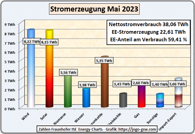 Die Stromproduktion im Mai 2023 war außerordentlich. Erstmals in der Geschichte der Erneuerbaren Energien überholte die Solarstromproduktion in einem Monat die Kohlestromproduktion (Braun- und Steinkohleproduktion zusammen). Auch die Windstromproduktion war höher. Dadurch, dass der Stromverbrauch gegenüber dem Vorjahresmonat Mai 2022 um 6,6 % abgenommen hat und die Erneuerbaren um 6 % zugenommen haben, erhöhte sich der EE-Anteil am Verbrauch auf über 59 %. Was kaum zu glauben ist, aber die Zahlen sagen es, der Strom aus Braunkohle nahm um 56,6 % ab, Steinkohlestrom um 104 % und Erdgasstrom um 55 %. Dies wurde durch einen Importüberschuss ausgeglichen, hauptsächlich aus Dänemark. Der Börsenstrompreis wird im Mai bei ca. 8,1 C/kWh liegen. Mittlerweile ist Strom aus Steinkohlekraftwerken der teuerste Strom. Deshalb der enorme Rückgang der Steinkohleverstromung.