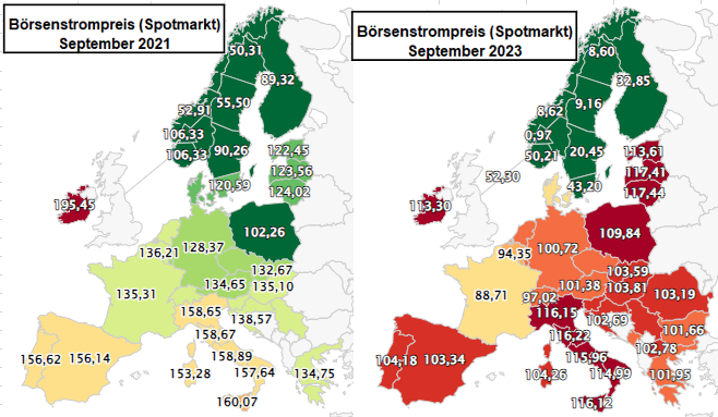 In der Grafik kann man den Börsenstrompreis links vom September 2021 und rechts vom September 2023 ersehen. September 2021 war der letzte Monat der alten SPD-CSU-CDU Regierung. Der Börsenstrompreis am Spotmarkt ist also in den letzten 2 Jahren von 12,8 Cent/kWh auf 10,07 Cent gefallen. Das ist für die Verbraucher eine gute Entwicklung.