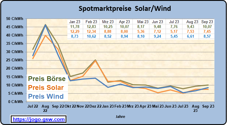 Der Marktwert für Solar- und Windstrom ist weiterhin sehr stabil und weit unter den Spitzenpreisen des Vorjahres. Anlagen über 100 kWp, die über einen Direktvermarkter den Strom vermarkten, bekommen den Marktwert bezahlt, soweit dieser über den anzulegenden Wert (EEG) liegt. Der September war ein weit, überdurchschnittlicher, sonnenreicher Monat mit einem Rekord an Solarerträgen. Der Windstromertrag war etwas schwach. Das merkt man dann an den Marktwert Solar und Wind. Der Marktwert für Windstrom ist deshalb im September auf 8,57 Cent/kWh gestiegen, während der Marktwert für Solarstrom leicht gefallen ist, obwohl der Spotmarktpreis gestiegen ist. Interessant sind die ersten Tage im Oktober, hier haben wir viel Wind und auch relativ viel Sonne. Das führt dazu, dass der allgemeine Spotmarktpreis um 2 Cent gegenüber dem September gefallen ist. Also viel Sonne und Wind ergibt einen niedrigeren Börsenstrompreis.