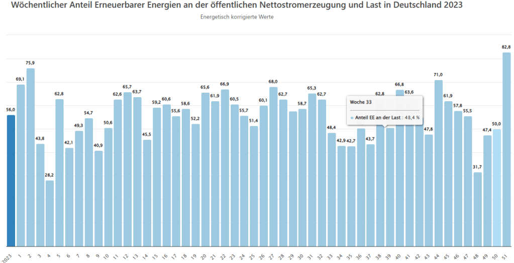 Wieder ein Rekord. Noch nie war der Anteil der Erneuerbaren Energien in einer Kalenderwoche so hoch wie in dieser Woche. Windstrom und Co. erzeugten tatsächlich in dieser Woche 83 % des Nettostromverbrauchs und das ist ein neuer Rekord. Das haben wir vor allem den 30.000 Windenergieanlagen mit dem Sturmtief „Zoltan“ zu verdanken. Ich schätzte, dass wir in drei Jahren so weit sind, dass wir in Deutschland eine Woche lang tatsächlich 100 % EE-Strom erreichen. Im Kalenderjahr 2023 lag der Anteil bisher bei ca. 56 % liegen. In den Medien hörte man die letzte Tage 52 %. Diese 52 % beziehen sich auf den Bruttostromverbrauch. Nettostromverbrauch ist der Strom, der aus der Steckdose kommt. Beim Bruttostromverbrauch ist z.B. der Eigenverbrauch der Kohle- und Gaskraftwerke mit enthalten.