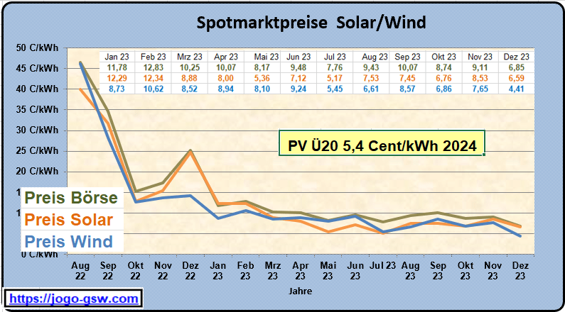 Der Dezember 2023 war geprägt von einem hohen Windstromanteil und auf Grund der Feiertage sowie der warmen Witterung von einen geringeren Verbrauch. Das führte dazu, dass der Strompreis an der Börse mit 6,85 C/kWh den niedrigsten Wert in diesem Jahr erreichte. Normalerweise ist der Preis im Winter am höchsten. Der Marktwert Solar lag bei 6,59 Cent, der Marktwert Wind bei 4,41 Cent. Aufs Jahr gesehen waren die Monate Juli und Dezember die Monate mit dem höchsten Anteil erneuerbarer Energie und das führte in diesen Monaten zu den niedrigen Börsenstrompreisen.