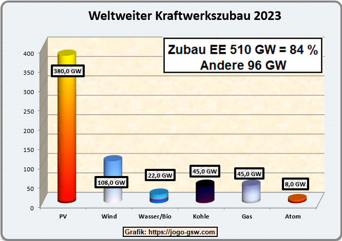 Nicht nur in Deutschland nahm der Zubau von Erneuerbaren Kraftwerken rasant zu, sondern auch weltweit. Mit insgesamt 510 GW wurden 2023 50 % mehr Erneuerbare zugebaut als 2022 mit 340 GW. 84 % des gesamten Zubaus der Kraftwerkskapazitäten entfielen auf die Erneuerbaren. Bei den Zubau von Kohlekraftwerken müsste man eigentlich die stillgelegten Kraftwerke abziehen, genauso bei den Atomkraftwerken. Es wurden gerade in den USA aber auch China ca. 20 GW Kohlekraftwerke stillgelegt. Bei den Atomkraftwerken waren es über 10 GW. Mahr als die Hälfte des Zubaus von Solar- und Windkraftwerken entfiel auf China. Geht der Zubau so weiter, wird tatsächlich das Ziel der COP 28 bis 2030 (Zubau zu verdreifachen) erreicht. COP 28 bedeutet die Konferenz der Vertragsstaaten der Klimarahmenkonvention der Vereinten Nationen zum 28. Mal diesmal in Dubai.