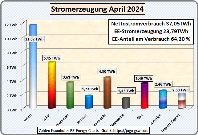 Wieder ein neuer Rekord. 64,2 % des in Deutschland erzeugten Strom kam von den Erneuerbaren. Das ist der höchste Wert in einem Monat bisher. Der letzte Rekord stammt vom Dezember 2023 mit 63,5 %. Zum ersten Mal erzeugten die PV-Anlagen in einem April mehr Strom als Braun- und Steinkohlekraftwerke zusammen. Gegenüber dem April 2022 hat sich die Stromerzeugung aus Kohle halbiert. Gegenüber dem April 2023 ist der Stromverbrauch gleichgeblieben, aber ca. 7 % unter dem Verbrauch vom April 2022. Der Windstrom und auch der Solarstrom legten in diesem April stark gegenüber April 2023 zu. Der Börsenstrompreis lag im April bei 6,2 Cent/kWh. Da auch in den anderen europäischen Ländern die Stromproduktion aus Solar und Wind zunahm, ist in ganz Europa der Strompreis niedrig. Das führt dazu, dass die Kohlekraftwerke mit dem teuersten Strom abgeschaltet wurden und wir in Deutschland einen Stromimport Überschuss von 7 %, vor allem aus dem nordischen Ländern hatten. So kann es weitergehen.