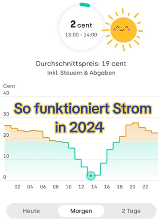 Ab 2025 müssen Netzbetreiber bei einem Kunden, der regelbare Verbraucher hat, einen dynamischen Stromtarif anbieten. Mittlerweile gibt es aber bereits einige Anbieter, wie E-ON, Tibber etc. die jetzt bereits einen dynamischen Stromtarif anbieten. In der Regel braucht der Kunde dazu einen intelligenten Stromzähler (Smart Meter) oder zumindest wie bei Tibber, einen Impulsgeber. Man zahlt eine Grundgebühr, z.B. 6 Euro je Monat und einen Arbeitspreis. Dieser setzt sich zusammen aus dem stündlichen Börsenstrompreis zuzüglich Netzkosten, Steuern und Abgaben. In der obigen Grafik sieht man z.B. den voraussichtlichen Arbeitspreis für Morgen. In der Mittagszeit beträgt er 2 Cent, am Abend 30 Cent. Durch die Verschiebung des Verbrauchs auf billige Zeiten, kann man echt Geld sparen. Wenn ich also Morgen in der Zeit zwischen 12.00 Uhr und 15.00 Uhr mein E-Auto lade fahre ich fast umsonst. Eine großartige Sache, denn es hilft, den Verbrauch der Erzeugung anzupassen.