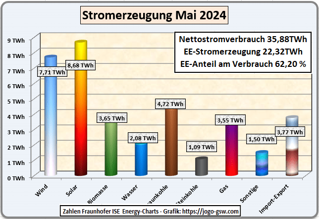 Auffallend für den Mai 2024 ist der geringe Stromverbrauch mit 35,88 TWh. Seit 2021, seit ich die Veröffentlichung der Stromproduktion mache, war der Stromverbrauch noch nie so niedrig. Im Durchschnitt für die Sommermonate ca. 10 % niedriger als früher. Es wird also Strom gespart, wobei mittlerweile ca. eine TWh des Solarstroms selbst genutzt wird (Eigenverbrauch) und deshalb beim Stromverbrauch nicht enthalten ist. Das führt dazu, dass der Anteil der Erneuerbaren gleichzeitig steigt, auch wenn, wie jetzt im Mai, die absoluten Werte gegenüber dem Vorjahresmonat gleichblieben. Im Mai war jetzt der Solarstrom die wichtigste Stromerzeugungsart. Obwohl der Mai von der Sonneneinstrahlung ca. 10 % schlechter war als im Vorjahr, erhöhte sich aber die Solarstromproduktion von 8,15 TWh auf 8,68 TWh, weil 2023 14 GW PV dazu gebaut wurde. Der Windstrom nahm im Mai von 8,22 TWh auf 7,71 TWh ab. Wasserkraft legte leicht zu, dass ist auf Grund der nassen Monate kein Wunder. Da der Kohlestrom die teuerste Stromerzeugungsart ist, nahm dieser gegenüber dem Vorjahr weiter um 14 % ab. Da es in Europa derzeit einen Stromüberschuss gibt und dadurch der Strom billig ist, wurde der Rückgang des Kohlestroms durch Importe, vor allem aus Dänemark und Frankreich ersetzt. Auffallend dabei ist, dass jetzt auch die französischen AKW’s in Zeiten vom Stromüberschuss ihre Anlagen runterregeln müssen. Der Börsenstrompreis pendelte sich im Mai auf 6,7 Cent je kWh ein. Auch der Anteil des erneuerbaren Stroms am Nettostromverbrauch, liegt in diesem Jahr stabil bei über 60 %. Sollte mal ein richtig, sonniger Monat kommen, könnten die PV-Anlagen in einem Monat 10 TWh Strom erzeugen und damit ca. 27 % des Nettostromverbrauchs. Es bleibt spannend.