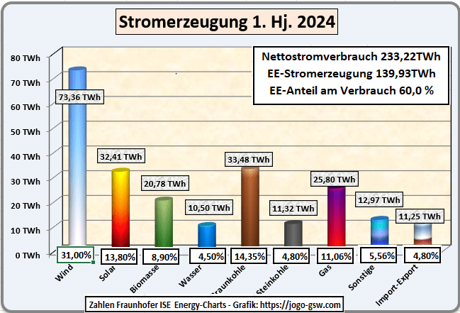 In der Grafik habe ich die Stromproduktion im 1. Hj. 2024 dargestellt.
