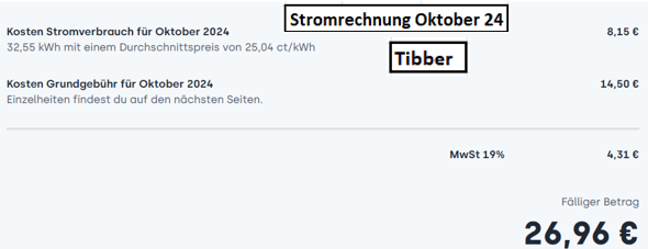 Hier ist meine Stromrechnung für Heizung/Auto/Haaus für Oktober 26,96 €.