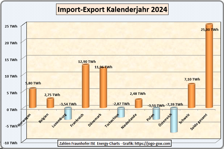 2024 ging die Verstromung von Kohle um 15 % zurück und erreichte einen absoluten Tiefpunkt. Kohlestrom war einfach zu teuer. Deshalb kauften unsere Netzbetreiber lieber billigeren Strom aus den Nachbarländern zu. Der europäischer Stromverbund funktionierte und setzt immer auf den günstigsten Strom. Beim Import von Strom aus Dänemark ist auch Strom aus Schweden mit dabei. Dieser wird über Dänemark nach Deutschland durchgeleitet. Seit 2024 produzierten die französischen Atomkraftwerke ohne große Unterbrechungen. Deshalb der hohe Überschuss aus Frankreich. Der Importüberschuss hat nichts mit dem Ausstiegs Deutschland aus der Atomenergie zu tun, denn wir brauchen die Stromimporte nur in Zeiten bei zu wenig Wind und Sonne.