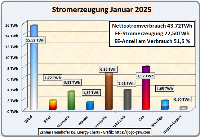 Der Windstrom schwächelt weiter. So das Ergebnis der Stromerzeugung im Januar 2025. Insgesamt betrug der Anteil des Erneuerbaren Stroms 51,5 % am Nettostromverbrauch. Im Januar 2024 betrug der Anteil noch 59 %. Auffallend war der Rückgang des Windstroms um 18 %. Der Anteil des Windstroms betrug aber trotzdem noch 35,5 % am Nettostromverbrauch. Das wurde vor allem durch eine höhere Erdgasverstromung (+17 %) ausgeglichen. Auch die solare Stromerzeugung erhöhte sich um 15 % aber im Januar auf einen niedrigeren Niveau. Die Kohleverstromung blieb gleich. Auffallend auch der leichte Rückgang der Stromerzeugung aus Biomasse und Wasserkraft. Da 2024 insgesamt 2.400 Windanlagen mit 14 GW genehmigt wurde und diese in den nächsten zwei Jahren gebaut werden, wird sich die Windstromerzeugung auch bei schwachen Wind wieder erhöhen. Der Import-Überschuss bewegte sich auf einen niedrigen Niveau mit 0,5 TWh.