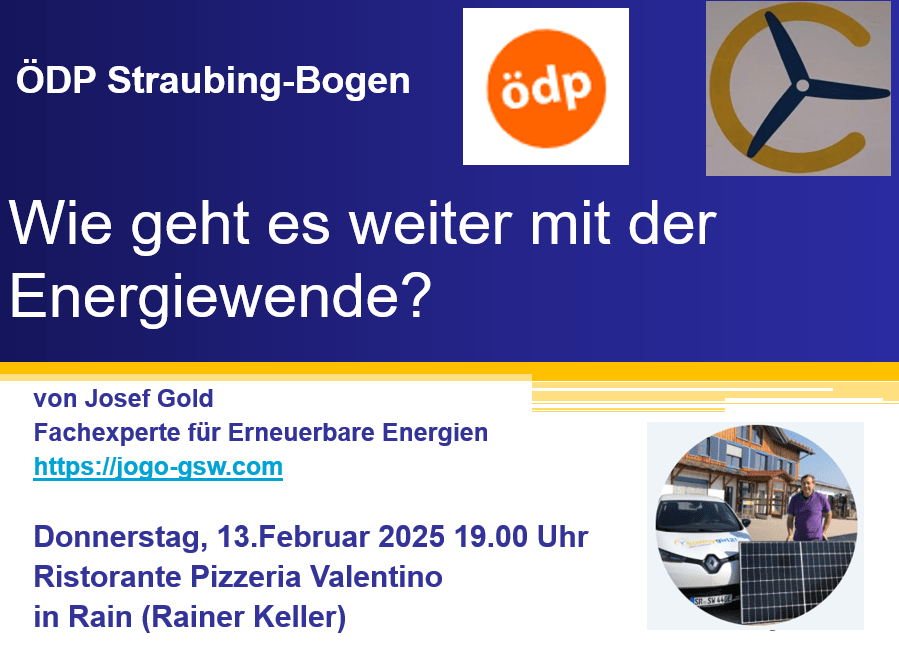 Wie geht es weiter mit der Energiewende? Zu diesem Infovortrag möchte ich Euch gerne einladen. Mit dem Zubau von Photovoltaikanlagen 2024 mit 16,2 GW wurde ein weiterer Rekord aufgestellt. Fast 2.400 Windanlagen an Land mit 14 GW Leistung erhielten eine Baugenehmigung, leider davon nur 33 aus Bayern. 227 GW Batteriespeicher sind in Planung. Auch wir von GSW werden in diesem Jahr in Atting unseren ersten großen Batteriespeicher errichten. Die Energiewende nimmt also Fahrt auf. Sektorenkopplung, Netzausbau und Stromspeicher sind die Herausforderungen der nächsten Jahre. Die Frage ist, was macht die Politik nach den Wahlen. Friedrich Merz ist ein Windkraftgegner, Spahn und Linnemann von der CDU wollen nur eine Schein-Energiewende, die AFD möchte sofort aus der Energiewende aussteigen und gleich das EEG abschaffen. Es wird also spannend. Ich würde mich freuen, am Donnerstag, den 13. Februar 2025 um 19.00 Uhr in Rain, Pizzeria Valentino (Rainer Keller) Euch begrüßen zu dürfen.
