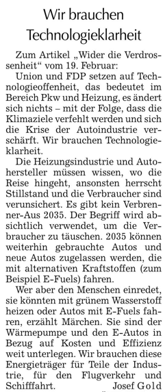 Union und FDP setzen auf Technologieoffenheit, das bedeutet im Bereich PKW und Heizung, es ändert sich nichts mit der Folge das die Klimaziele verfehlt werden und sich die Krise der Autoindustrie verschärft. Wir brauchen Technologieklarheit. Die Heizungsindustrie und Autohersteller müssen wissen, wo die Reise hingeht, ansonsten herrscht Stillstand und die Verbraucher sind verunsichert. Es gibt kein Verbrenner-Aus 2035. Der Begriff wird absichtlich verwendet, um die Verbraucher zu täuschen.  2035 können weiterhin gebrauchte Autos und neue Autos zugelassen werden, die mit alternativen Kraftsoffen (z.B. E-Fuels) fahren. Wer aber den Menschen einredet, sie könnten mit grünem Wasserstoff heizen oder Autos mit E-Fuels fahren, erzählt Märchen. Sie sind der Wärmepumpe und den E-Autos in Bezug auf Kosten und Effizienz weit unterlegen. Wir brauchen diese Energieträger für Teile der Industrie, für den Flugverkehr und Schifffahrt.