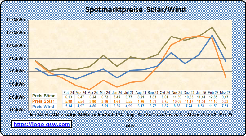 Die Zeiten der hohen Spotmarktpreise, wie wir sie bisher in diesem Winter gesehen haben, sind vorbei. Der Spotmarktpreis für Solar fiel im März 2025 auf 5,03 Cent je kWh, das ist weniger als die Hälfte vom Februar 2025. Der Spotmarktpreis Wind pendelte sich auf 7,51 Cent ein. Der starke Rückgang bei Solar hing auch damit zusammen, dass ausgerechnet an den beiden letzten Wochenenden im März die hohe Solarstromproduktion auf einen schwachen Verbrauch fiel. Es kommt also immer auch auf den Wochentag drauf an, wann wir eine hohe Solarstromproduktion haben.