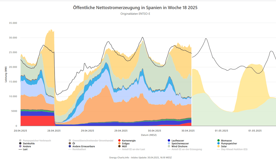 Am Montag, 28.04.2025 12.34 Uhr kam es in Spanien und Portugal zu einem Blackout der Stromversorgung. Im ganzen spanischen Festland und durch den Stromverbund auch im benachbarten Portugal und einen Teil Südfrankreich. Nachdem die Stromversorgung nach 12 Stunden wieder weitgehendst hergestellt ist, wird über die Ursachen spekuliert. In Spanien ist das Stromnetz schwach und außerdem am Ende des europäischen Stromverbunds. Es gab um diese Zeit im Landesinneren extrem, heiße Temperaturen. Man vermutet, dass induzierte atmosphärische Vibrationen, die schwachen 400 kV Höchststromleitungen zum Zusammenbruch brachten. Vielleicht war es aber auch Sabotage, ein Cyberangriff oder menschliches Versagen bei Schalthandlungen. Wir dürfen gespannt sein.