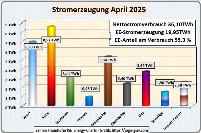 Der April 2025 war warm, sonnenreich und trocken. Das spiegelt sich auch in der Stromerzeugung wieder. Dank des sonnenreichen April stieg die solar Stromproduktion gegenüber den Vorjahresmonat um 33 % und war damit erstmals in einem April höher als die Windstromproduktion. Die Windflaute hält weiterhin an. Die Windräder produzierten 40 % weniger als ein Jahr zuvor. Wegen des trockenen Wetters lieferten auch die Wasserkraftwerke um 45 % weniger. Bei der Biomasse ging die Produktion um 14 % zurück. Dadurch mussten die Braun- und Steinkohlekraftwerke um 24 % bzw. 69 % mehr Strom liefern. Auch die Gaskraftwerke lieferten um 5,7 % mehr Strom. Der Anteil der Erneuerbaren Energien an dem Nettostromverbrauch betrug 55,3 %, der höchste Wert in diesem Jahr. Der April 2024 war natürlich sehr windreich und nass. Hier lag der EE-Anteil bei 64 %. In den nächsten Monaten werden die PV-Anlagen, die meiste Energie liefern. Um den PV-Strom im Netz unterzubringen, brauchen wir unbedingt große Stromspeicher. Planungen dazu gibt es genug. Leider machen aber bei uns die Bayernwerke Probleme bei der Netzzusage.