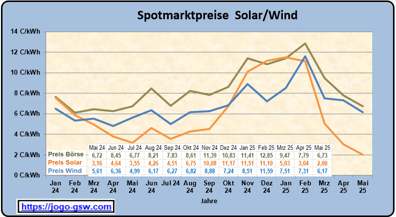 Gegenüber dem Jahreshoch im Februar 2025 sind im Mai die Spotmarktpreise stark gefallen. Das liegt am überdurchschnittlichen Solarstromangebot. Auffallend ist der starke Rückgang des Marktwert für Solarstrom auf 2 Cent je kWh. Das ist über 1 Cent weniger als vor einem Jahr. Der allgemeine Spotmarktpreis ist mit 6,73 Cent/kWh gleichgeblieben. Der Preis für Windstrom ist stabiler und liegt bei 6,17 Cent/kWh. Der geringe Marktwert Solar kommt vor allem wegen der vielen negativen Stunden an der Börse. In der Mittagszeit kostet der Strom an der Börse fast gar nichts (ohne Netzentgelte und Steuern und Abgaben) während in den Abendstunden der Strompreis meist über 10 Cent höher liegt. Diese Differenz ist wieder wichtig, um Stromspeicher wirtschaftlich zu betreiben. GSW wird in diesem Jahr den ersten Großspeicher errichten, wobei der Speicher gegenüber anderen Großspeicher, die derzeit gebaut werden, wieder klein ist.