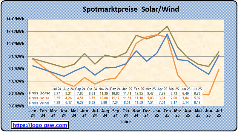 Völlig überraschend haben die Spotmarktpreise im Juli einen kräftigen Sprung nach oben gemacht. Besonders deutlich zeigte sich dies beim Marktwert für Solarstrom: Er stieg von 1,84 Cent/kWh im Juni 2025 auf 5,92 Cent im Juli. Hauptursache war die ungewöhnlich geringe Sonneneinstrahlung, die zu einer unterdurchschnittlichen solaren Stromerzeugung führte. In der Folge legte auch der Marktwert für Windstrom auf 8,17 Cent/kWh zu, während der allgemeine Spotmarktpreis auf 8,78 Cent kletterte – rund zwei Cent mehr als im Vorjahresmonat. Bemerkenswert ist dabei, dass der Anteil der erneuerbaren Stromerzeugung mit 58 % am Nettostromverbrauch auf demselben Niveau wie im Juli des Vorjahres lag. Zudem gab es nur an wenigen Tagen (zwölf Stunden) mit negativen Strompreisen.