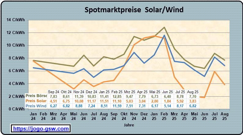 Wenn man die Börsenstrompreise (Marktwerte für Photovoltaik und Wind) der letzten zwölf Monate betrachtet, zeigt sich ein ständiges Auf und Ab. Der August 2025 war ein sonnenreicher Monat, weshalb der Marktwert für Solarstrom auf 3,83 Cent je kWh zurückging – allerdings immer noch höher als im Mai und Juni. Der durchschnittliche Börsenstrompreis lag mit 7,70 Cent je kWh auf einem relativ stabilen Niveau. Vergleichbar entwickelte sich der Marktwert für Windstrom, der bei 6,82 Cent je kWh lag.