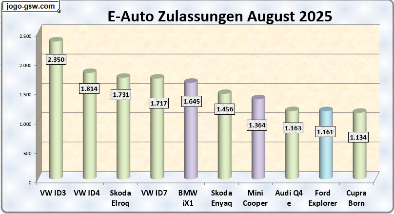 Von den zehn meistverkauften Autos stammen sieben aus dem Hause Volkswagen, angeführt vom VW ID.3 mit 2.350 verkauften Einheiten. Auf Platz fünf folgt der BMW iX1 mit 1.645 Stück. Das bisher dominierende Modell Tesla Model Y schafft es mit 678 Verkäufen nicht mehr unter die Top Ten. Es wurde im August kein einziges Wasserstoffauto neu zugelassen.