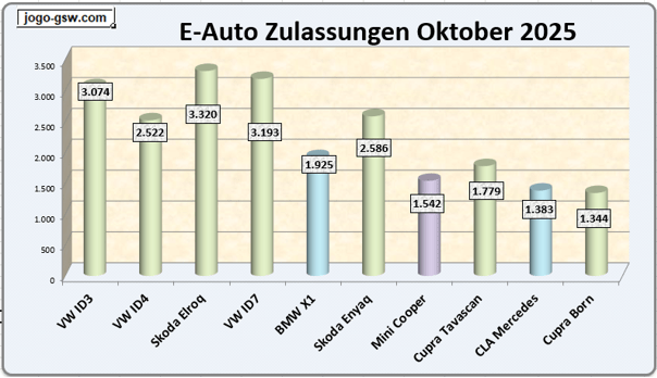 Den E-Auto Markt dominiert weiterhin der VW-Konzern. Unter den zehn meistverkauften E-Autos kamen 7 aus dem Hause von VW. Spitzenreiter unter den Modellen war diesmal der Skoda Elroq mit 3.320 verkauften Autos, gefolgt vom ID 7 und ID3. Alle mit über 3.000 verkauften Stromern. Der BMW X1 kam auf den 6. Platz und der Mercedes CLA erreichte den 9. Platz.