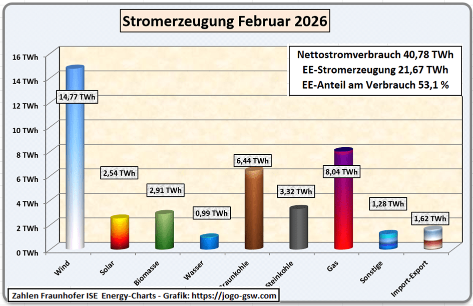 Die Stromerzeugung aus Windenergieanlagen erreichte 14,77 TWh und lag damit rund 50 % über dem Vorjahreswert, blieb jedoch weiterhin unter dem langjährigen Durchschnitt. Insgesamt deckten die erneuerbaren Energien 53,1 % des Nettostromverbrauchs ab. Im Februar 2025 hatte dieser Anteil noch 42,4 % betragen, im Januar 2026 waren es 49,8 %. Der Stromverbrauch insgesamt stieg gegenüber dem Vorjahr um 2 %.