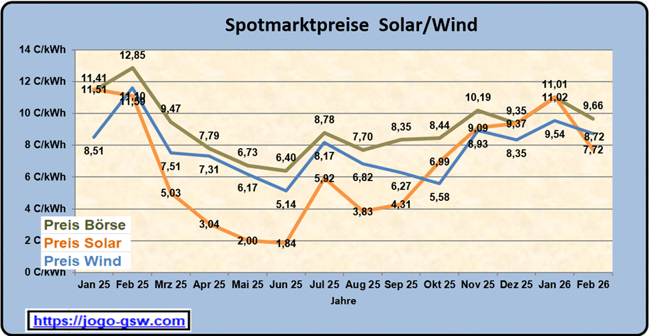 Der durchschnittliche Börsenstrompreis lag im Februar 2026 mit 9,66 Cent pro kWh deutlich unter dem Wert des Vorjahresmonats (12,85 Cent). Hauptursache dafür ist der deutlich gestiegene Anteil erneuerbarer Energien: Im Februar 2026 betrug er 53,1 %, während er im Februar 2025 noch bei 42,4 % lag. Infolgedessen sanken auch die Marktwerte für einzelne erneuerbare Energieträger. Der Marktwert für Solarstrom lag bei 7,72 Cent pro kWh, der für Windstrom bei 8,72 Cent pro kWh.