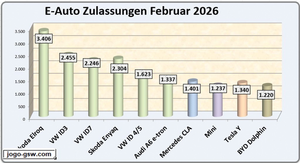 Der Skoda Elroq behauptet weiterhin die Spitzenposition, der VW-Konzern dominiert den deutschen E-Auto-Markt, und erstmals schafft es ein chinesischer Hersteller in die Top 10. So lässt sich die Entwicklung des E-Auto-Markts im Februar 2026 in einer Schlagzeile zusammenfassen.