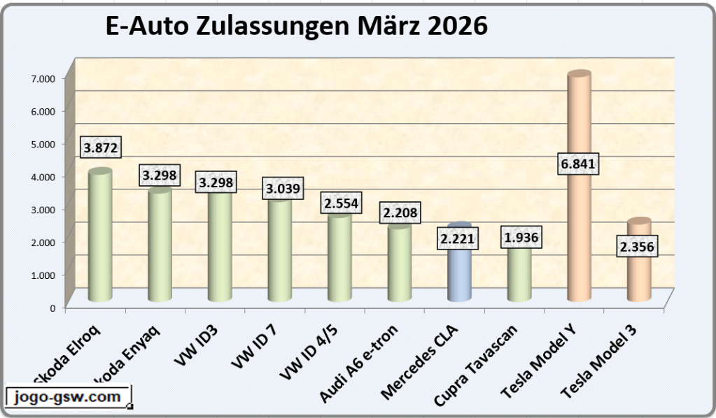 Auf den Plätzen zwei und drei folgen der Škoda Elroq (3.872) und der Enyaq (3.392). Dahinter reihen sich der VW ID.3 (3.298), der ID.7 (3.039) sowie der ID.4/5 (2.554) ein. Nach dem Tesla Model 3 auf Platz sieben belegt der Mercedes CLA (2.221) Rang acht, gefolgt vom Audi A6 e-tron (2.208). Den zehnten Platz sichert sich mit dem Cupra Tavascan (1.936) erneut ein Modell aus dem VW-Konzern.